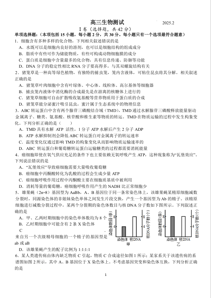 江苏省扬州中学2024-2025学年下学期2月高三月考生物+答案