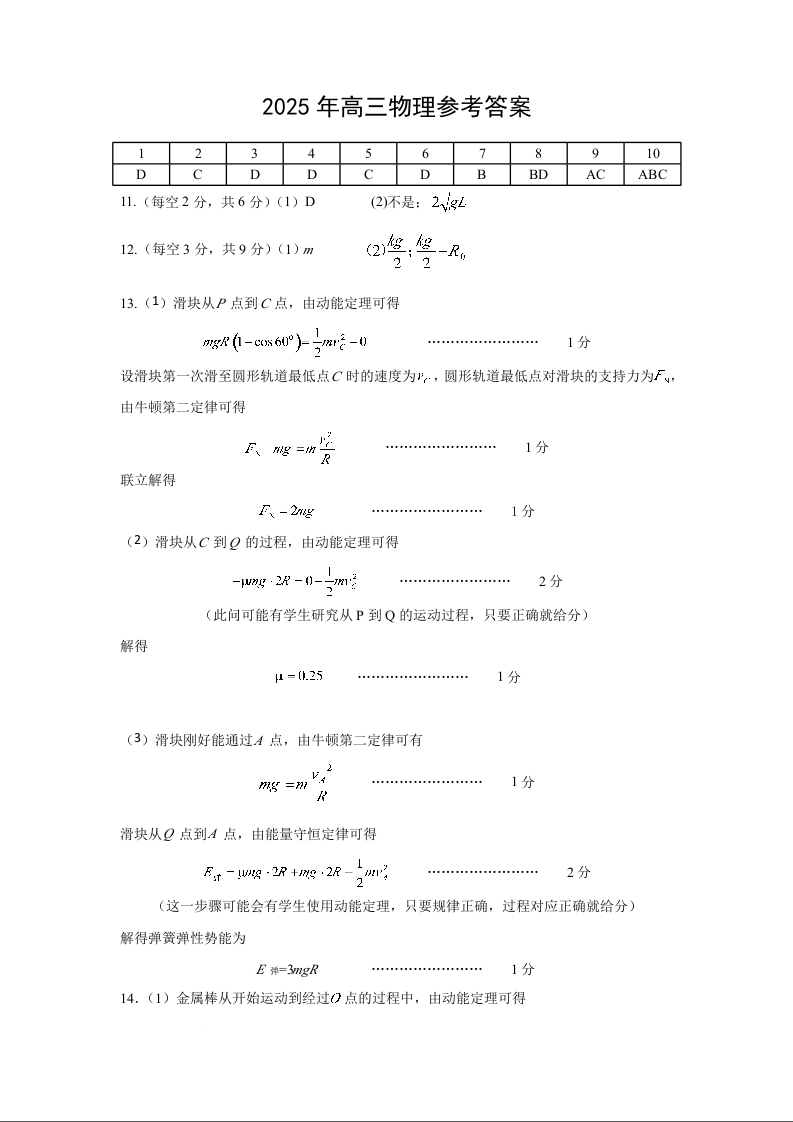 吉林省延边州2024-2025学年下学期2月高三教学质量检测物理答案