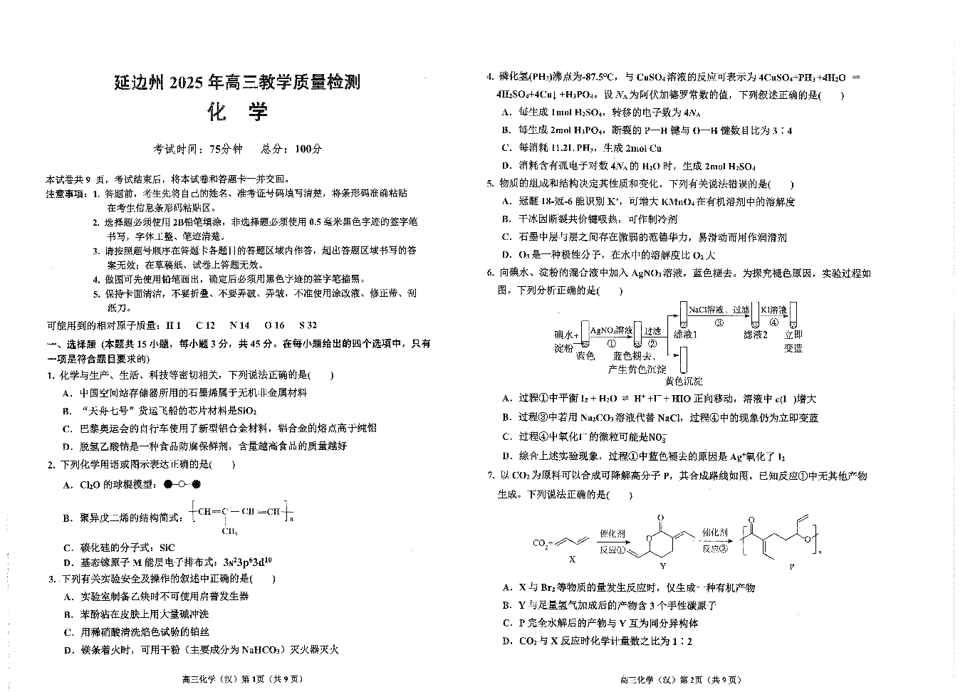 吉林省延边州2024-2025学年下学期2月高三教学质量检测化学