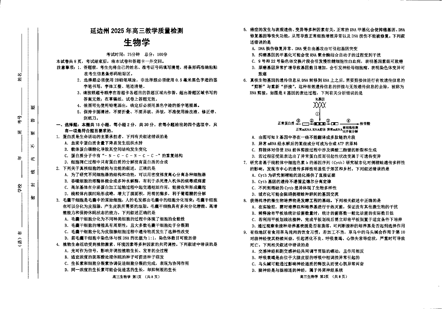 吉林省延边州2024-2025学年下学期2月高三教学质量检测生物+答案