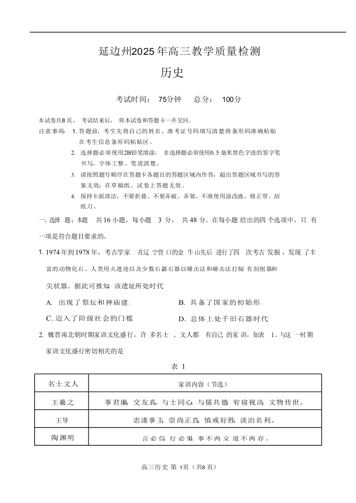 吉林省延边州2024-2025学年下学期2月高三教学质量检测历史