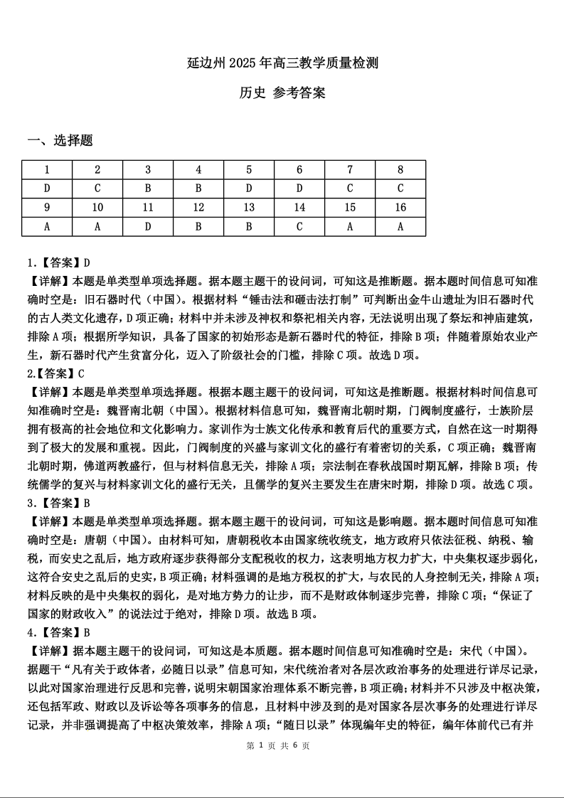吉林省延边州2024-2025学年下学期2月高三教学质量检测历史答案