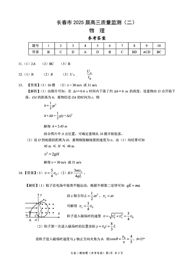 吉林省长春市2024-2025学年下学期高三质量监测(二模)物理答案