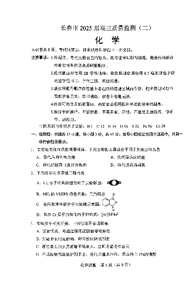 吉林省长春市2024-2025学年下学期高三质量监测(二模)化学