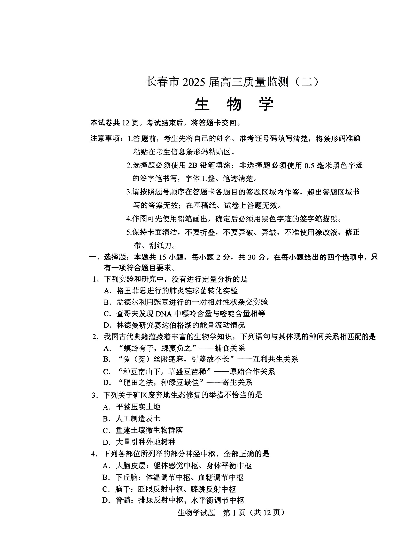 吉林省长春市2024-2025学年下学期高三质量监测(二模)生物