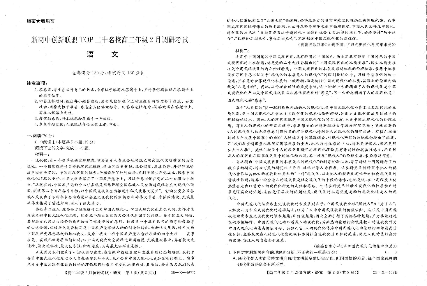 河南省TOP二十名校2024-2025学年下学期2月高二调研考试语文