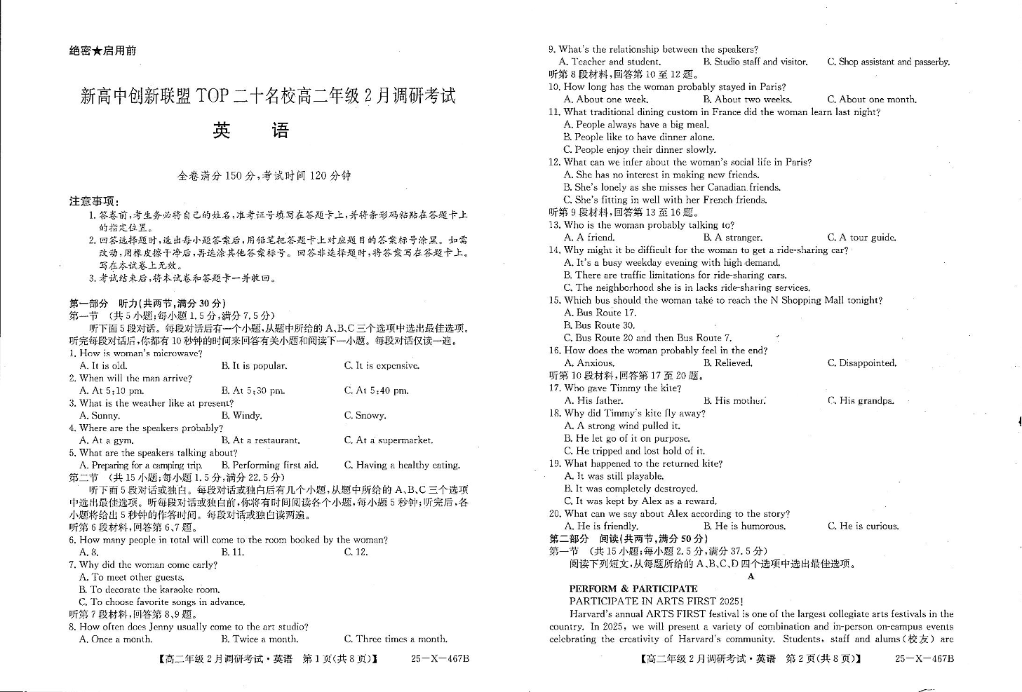 河南省TOP二十名校2024-2025学年下学期2月高二调研考试英语