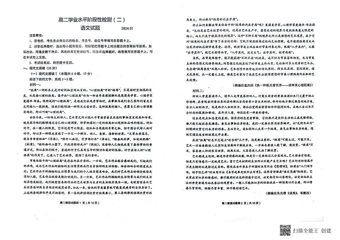 山东省青岛市莱西市2023-2024学年高二上学期1月期末考试语文