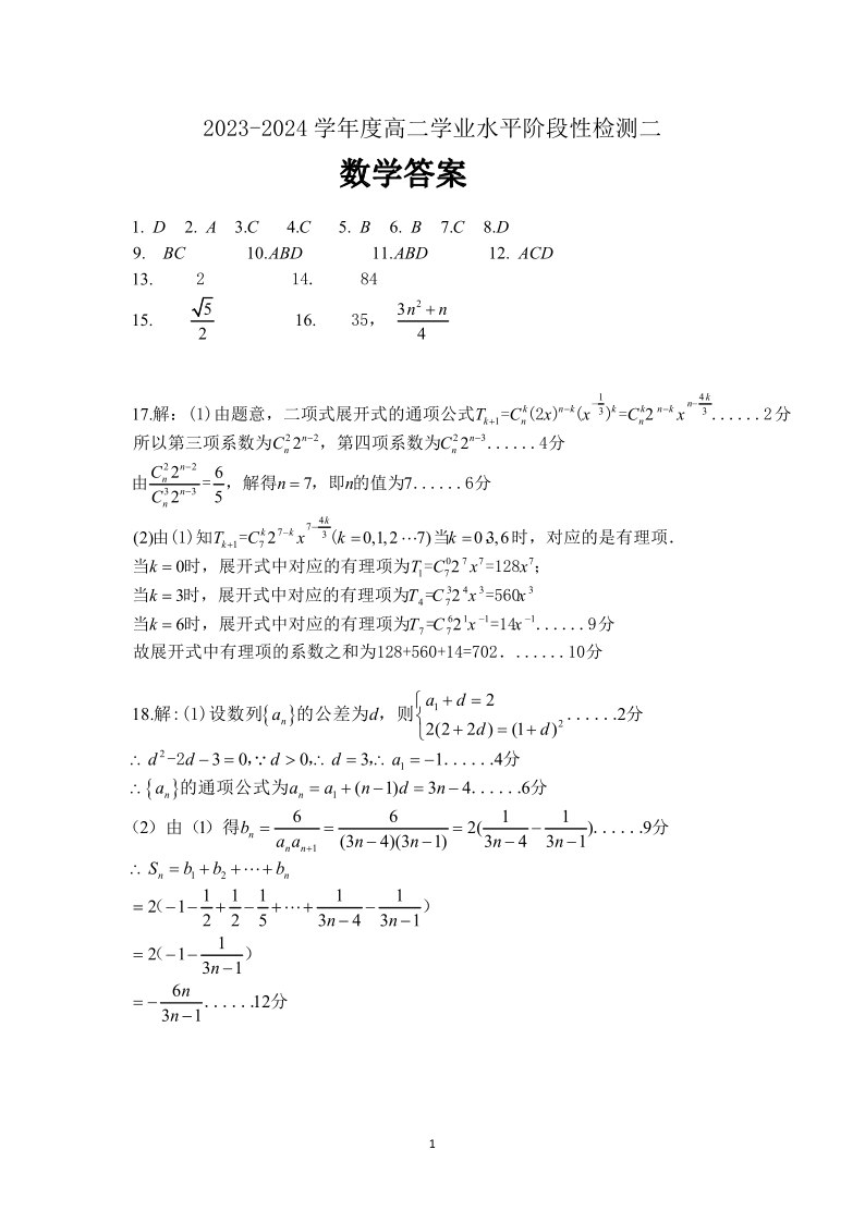 山东省青岛市莱西市2023-2024学年高二上学期1月期末考试数学答案