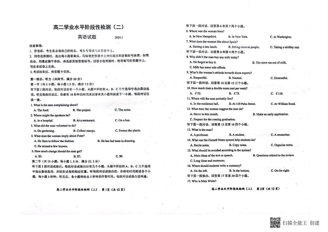 山东省青岛市莱西市2023-2024学年高二上学期1月期末考试英语+答案