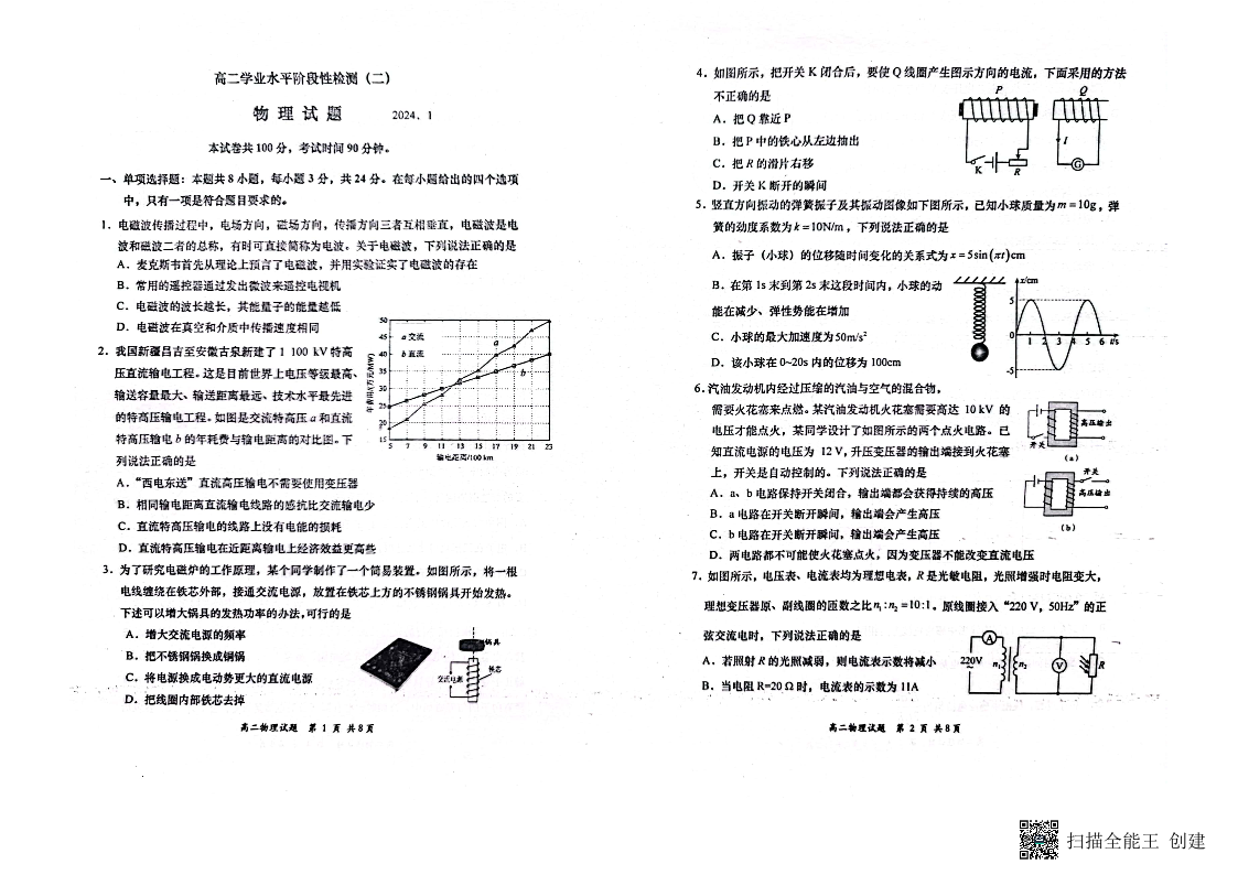 山东省青岛市莱西市2023-2024学年高二上学期1月期末考试物理