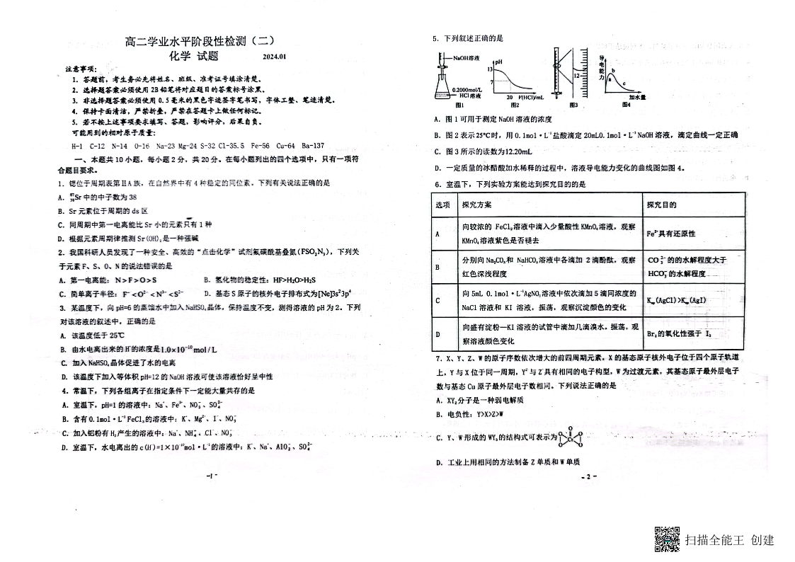 山东省青岛市莱西市2023-2024学年高二上学期1月期末考试化学