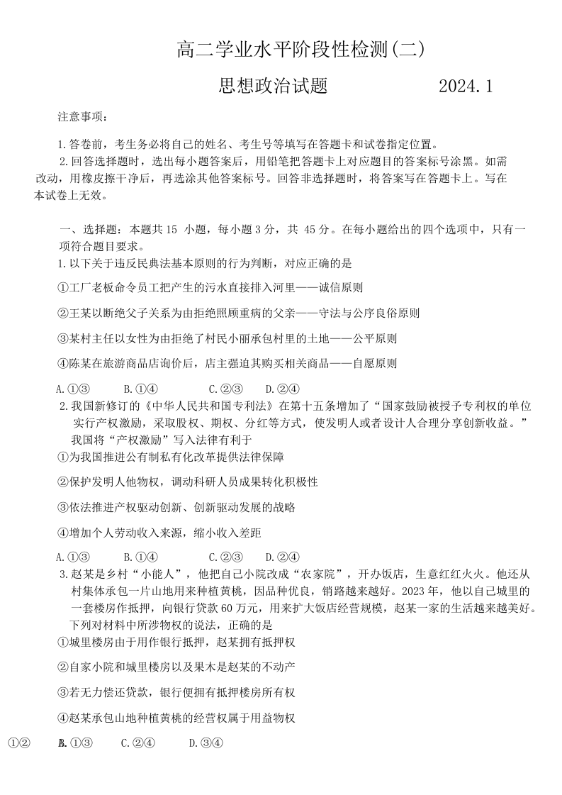 山东省青岛市莱西市2023-2024学年高二上学期1月期末考试政治