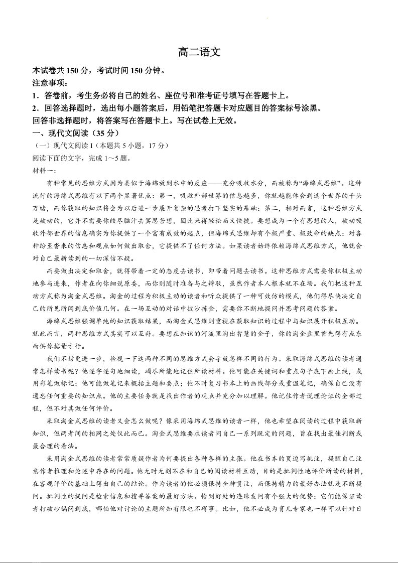 山东省威海市2023-2024学年高二上学期期末考试语文+答案