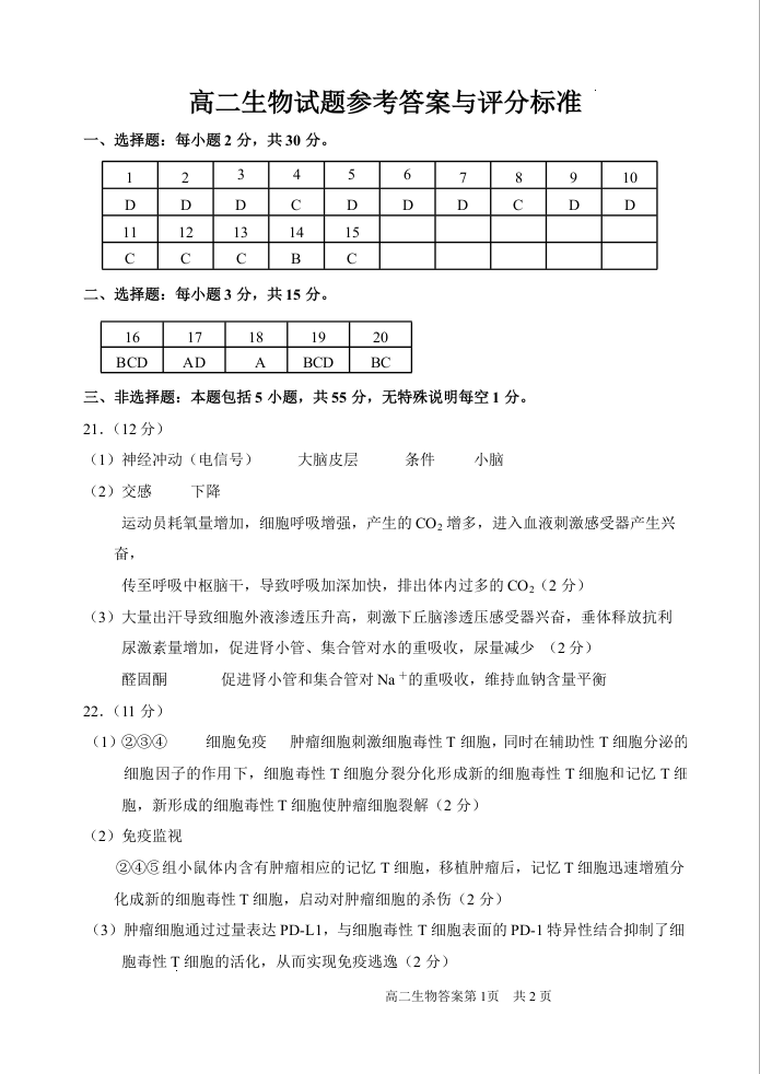 山东省威海市2023-2024学年高二上学期期末考试生物答案