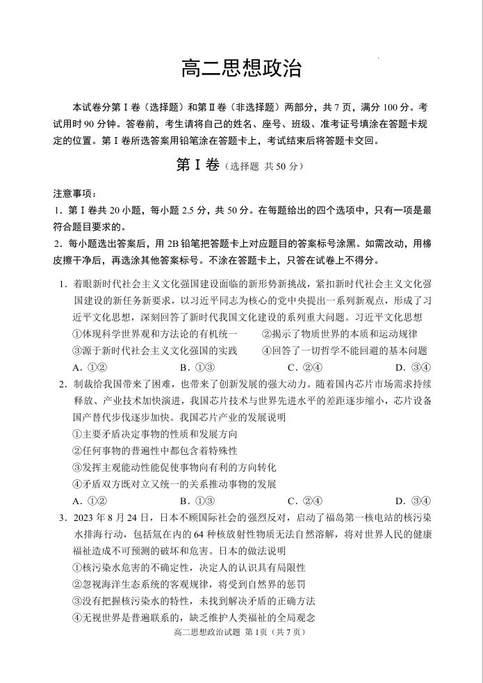 山东省威海市2023-2024学年高二上学期期末考试政治