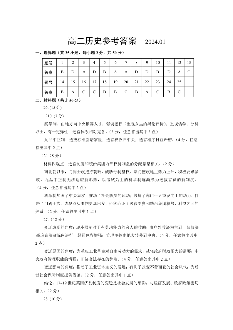 山东省威海市2023-2024学年高二上学期期末考试历史答案