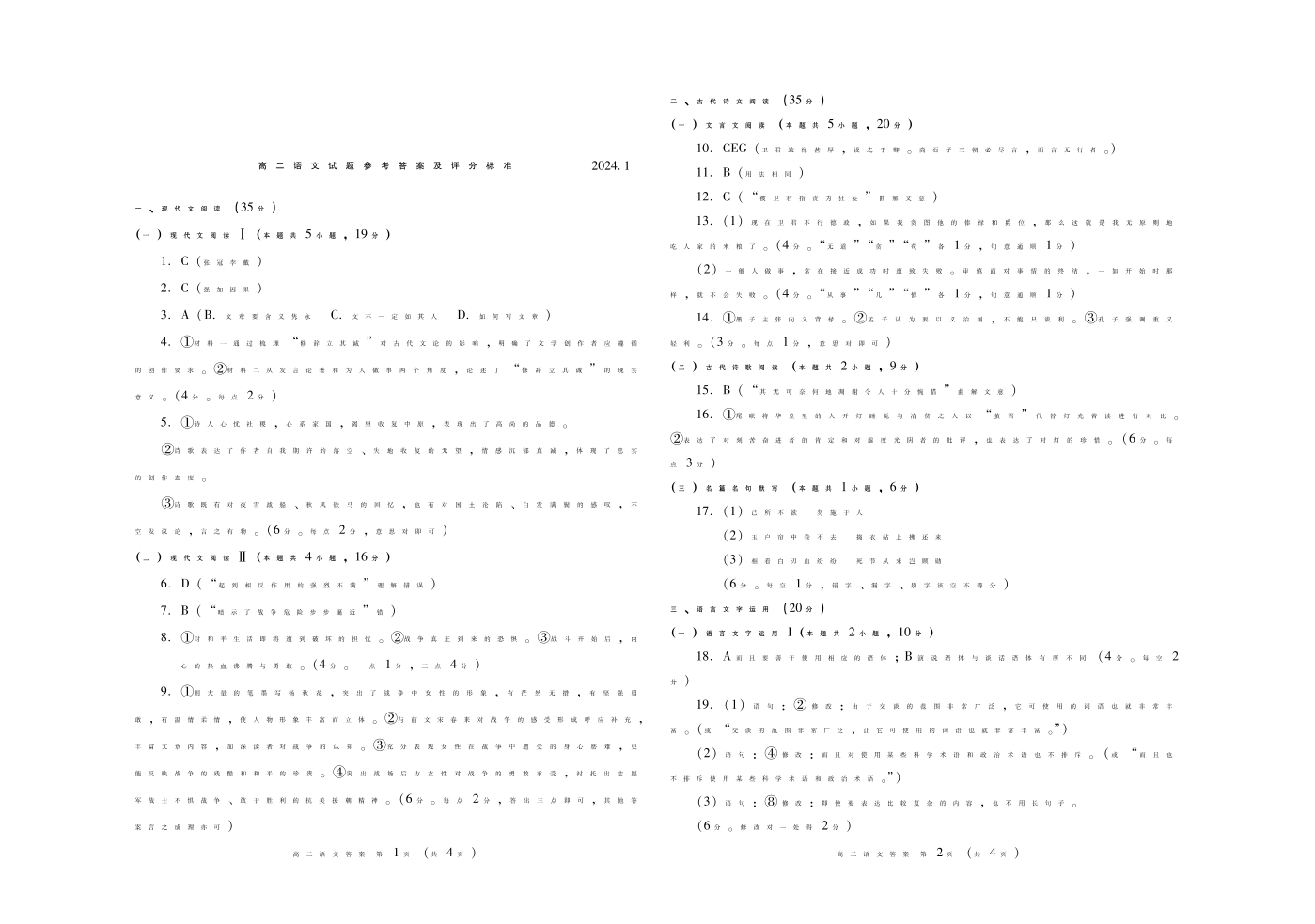 山东省潍坊市2023-2024学年高二上学期1月期末考试语文答案