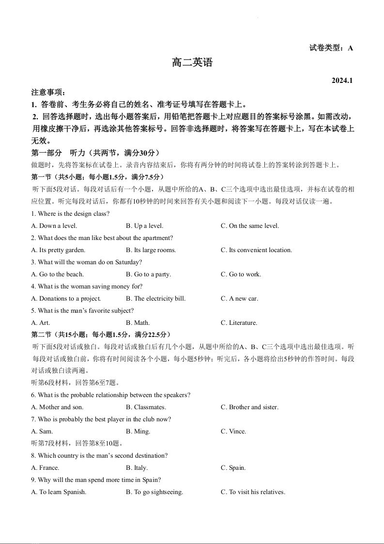 山东省潍坊市2023-2024学年高二上学期1月期末考试英语