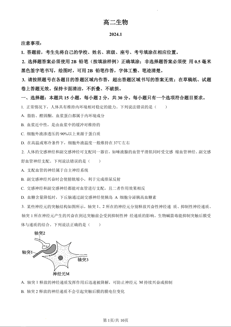 山东省潍坊市2023-2024学年高二上学期1月期末考试生物(原卷版)