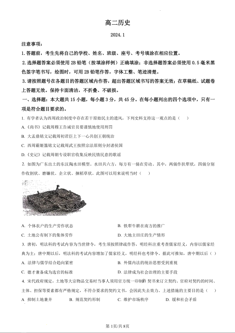 山东省潍坊市2023-2024学年高二上学期1月期末考试历史 (原卷版)