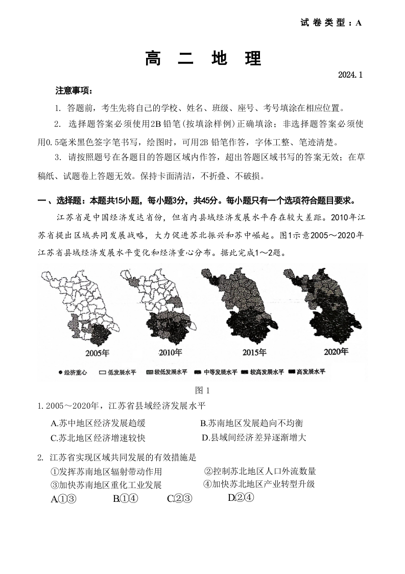 山东省潍坊市2023-2024学年高二上学期1月期末考试地理