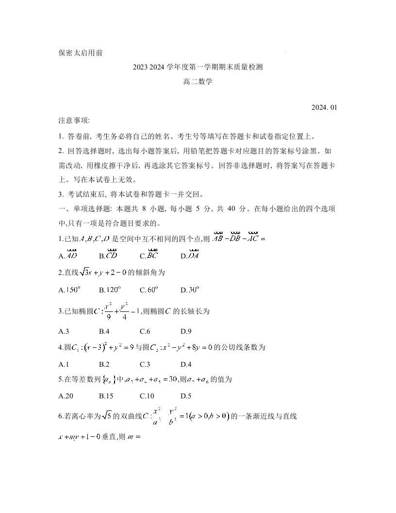 山东省枣庄市滕州市2023—2024学年高二上学期1月期末考试数学