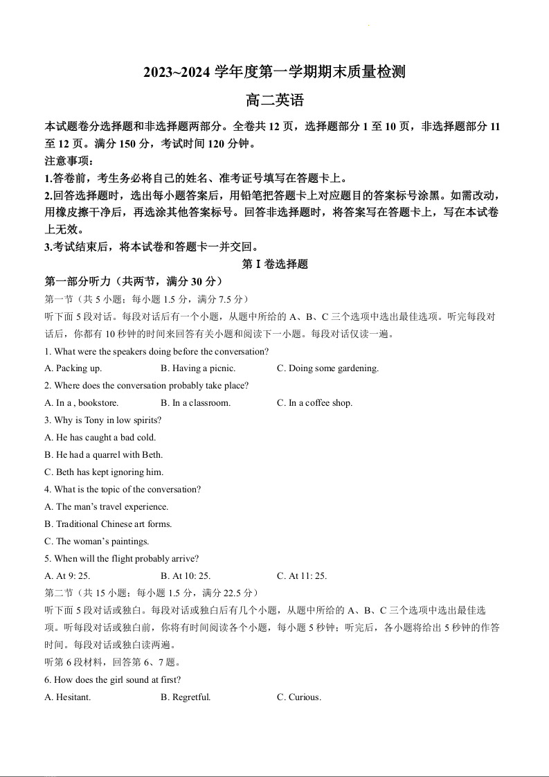 山东省枣庄市滕州市2023—2024学年高二上学期1月期末考试英语+答案
