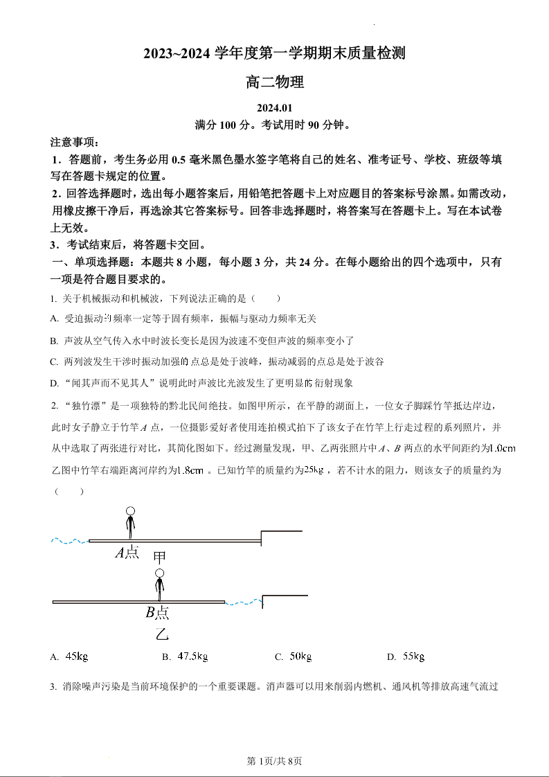 山东省枣庄市滕州市2023—2024学年高二上学期1月期末考试物理(原卷版)