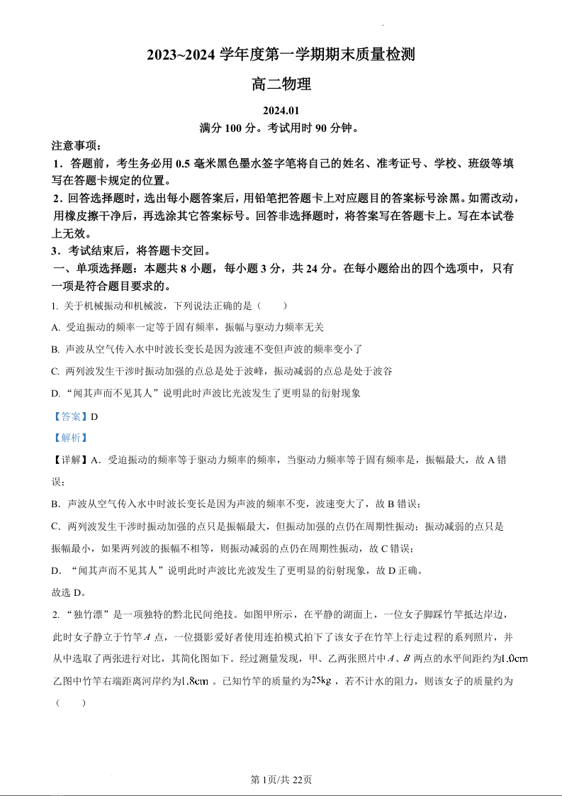 山东省枣庄市滕州市2023—2024学年高二上学期1月期末考试物理(精品解析版)