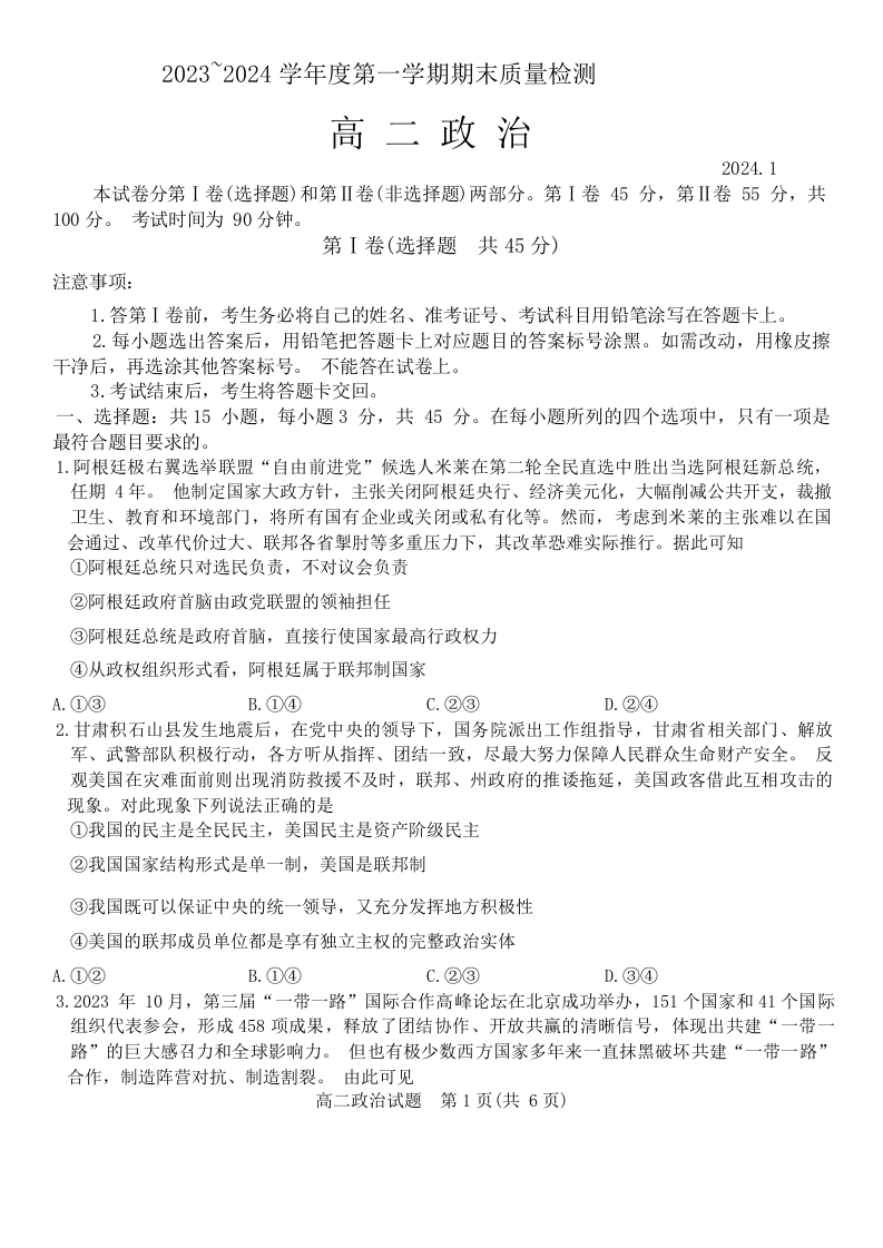 山东省枣庄市滕州市2023—2024学年高二上学期1月期末考试政治+答案