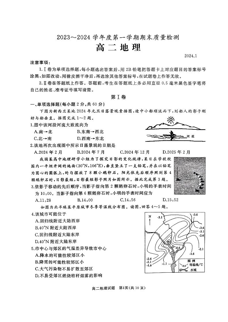 山东省枣庄市滕州市2023—2024学年高二上学期1月期末考试地理