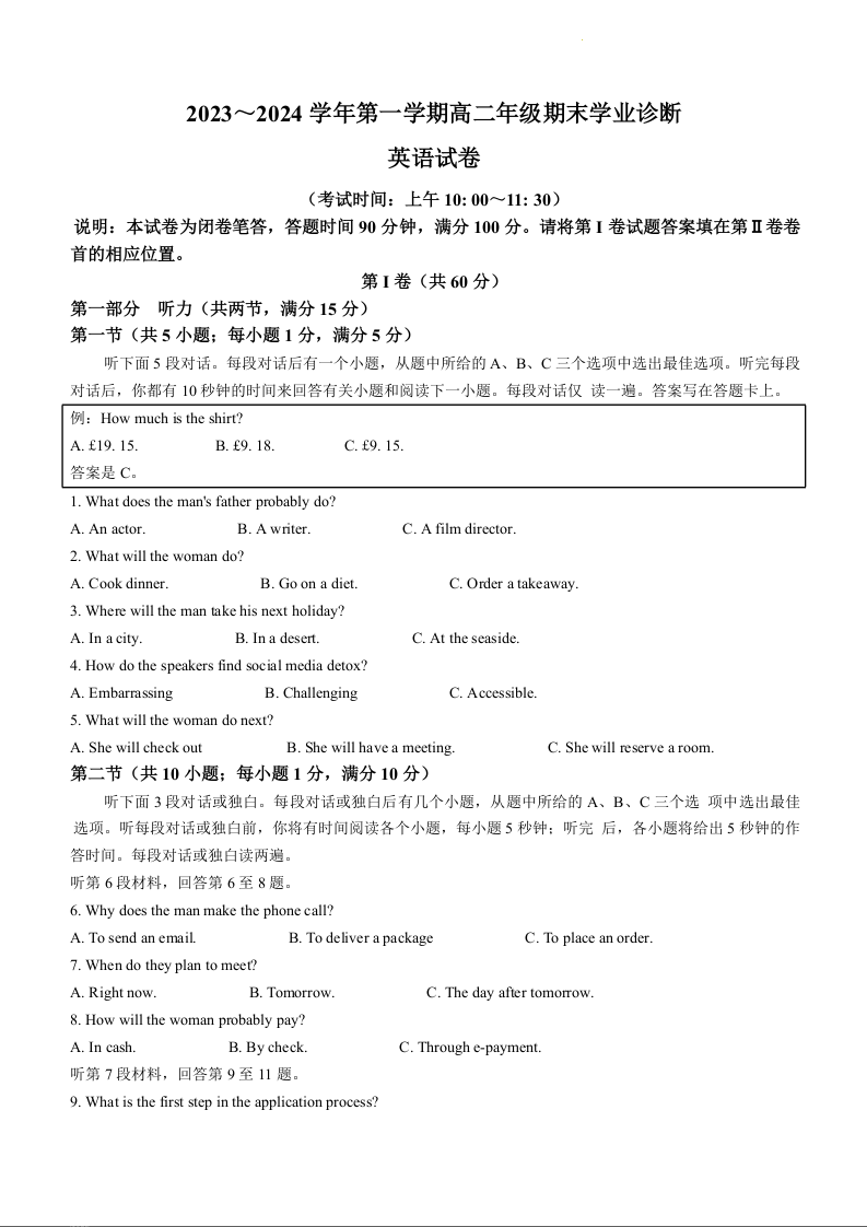 山西省太原市2023-2024学年高二上学期期末学业诊断考试英语+答案