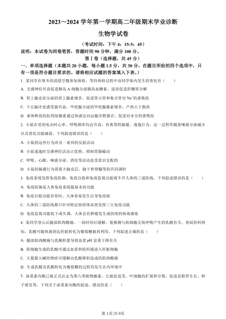 山西省太原市2023-2024学年高二上学期期末学业诊断考试生物(原卷版)