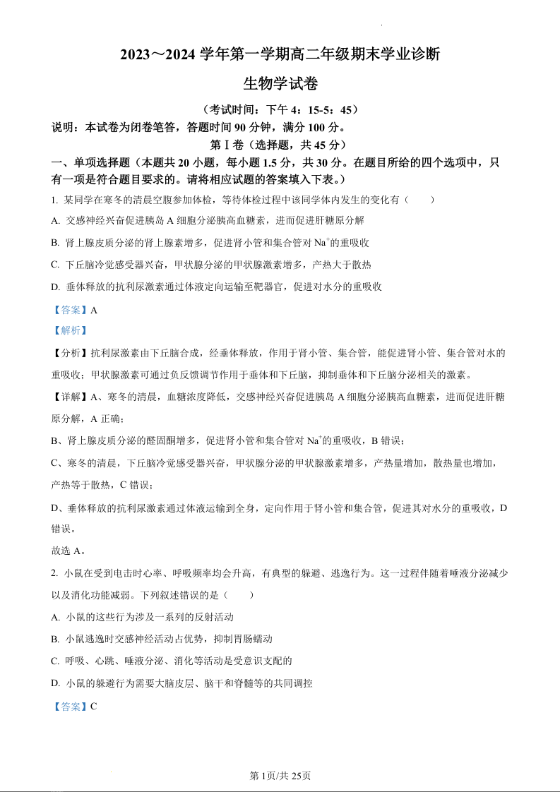 山西省太原市2023-2024学年高二上学期期末学业诊断考试生物(精品解析版)