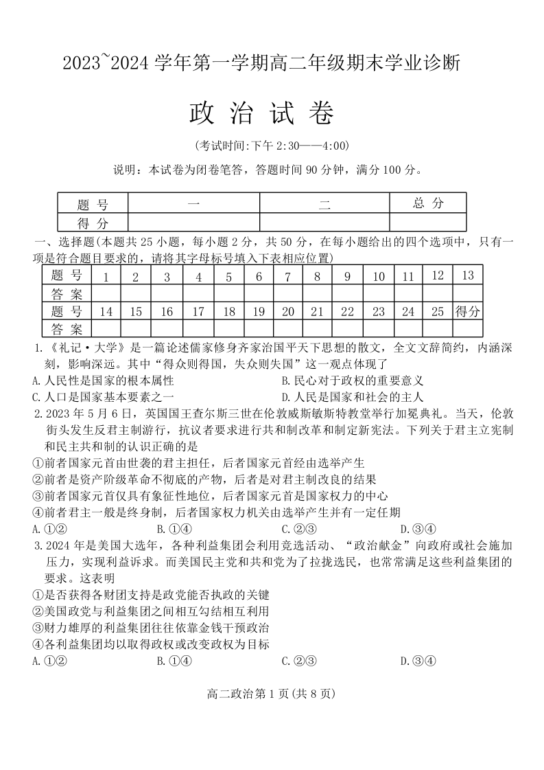 山西省太原市2023-2024学年高二上学期期末学业诊断考试政治
