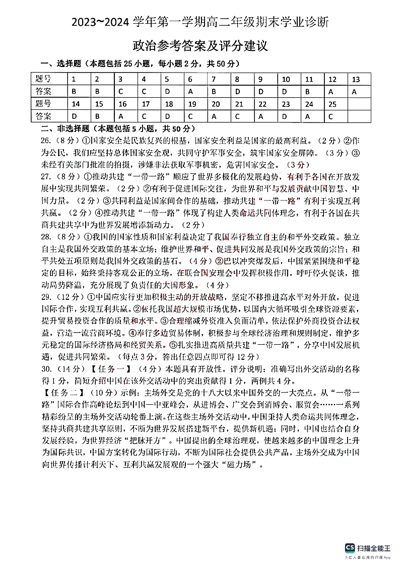 山西省太原市2023-2024学年高二上学期期末学业诊断考试政治答案
