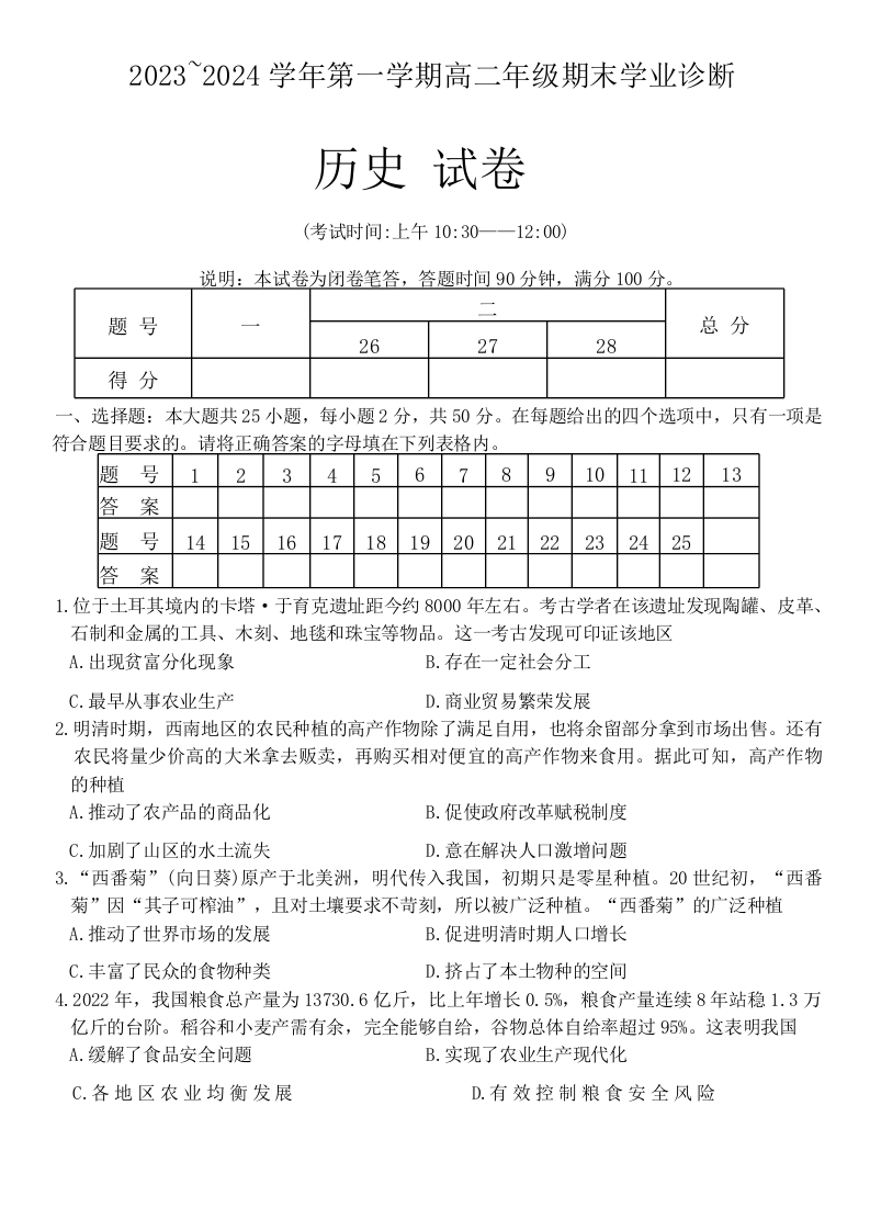 山西省太原市2023-2024学年高二上学期期末学业诊断考试历史
