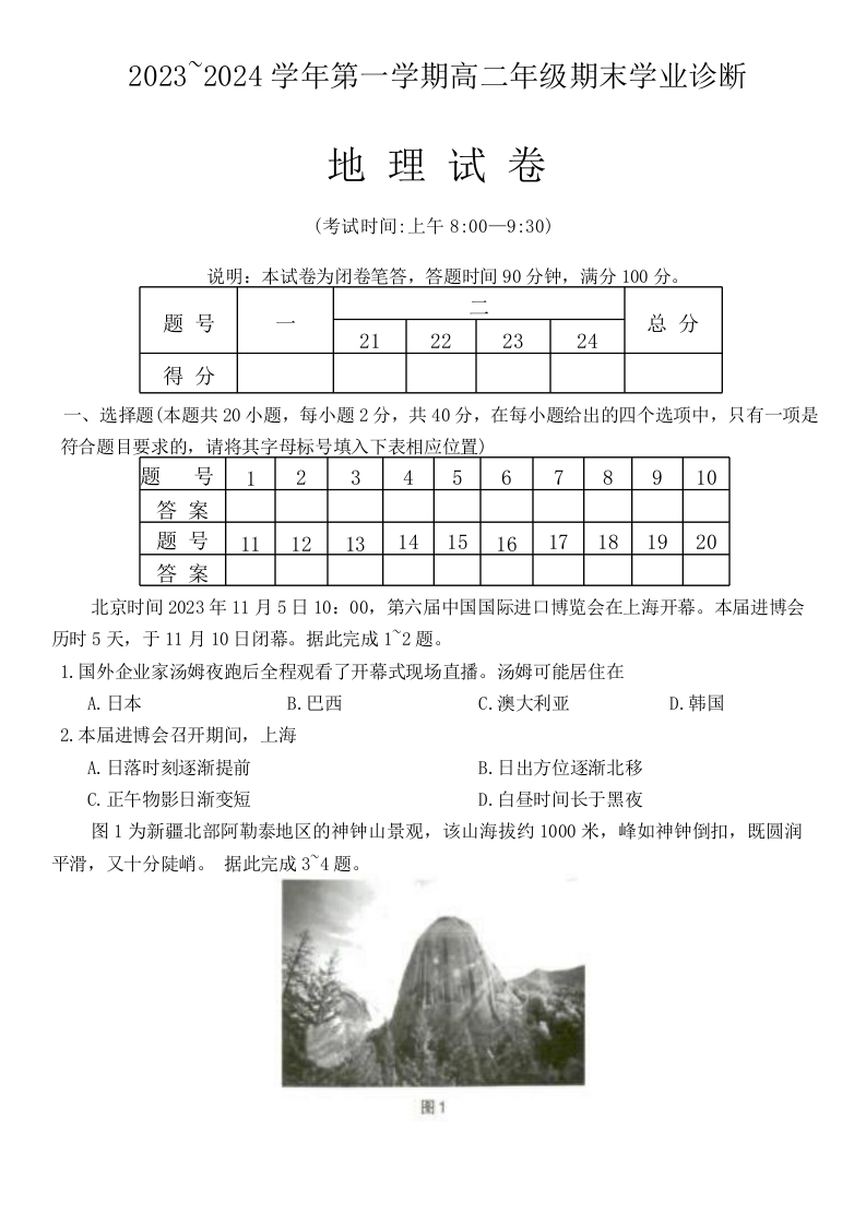 山西省太原市2023-2024学年高二上学期期末学业诊断考试地理