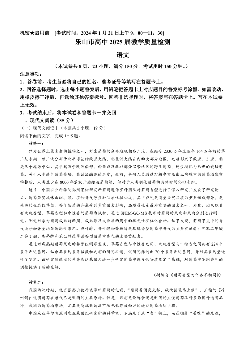 四川省乐山市2023-2024学年高二上学期期末考试语文+答案