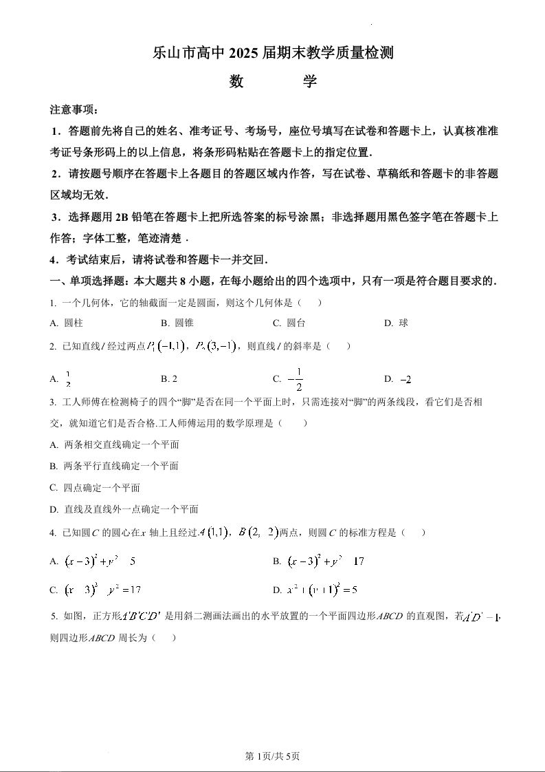 四川省乐山市2023-2024学年高二上学期期末考试数学(原卷版)