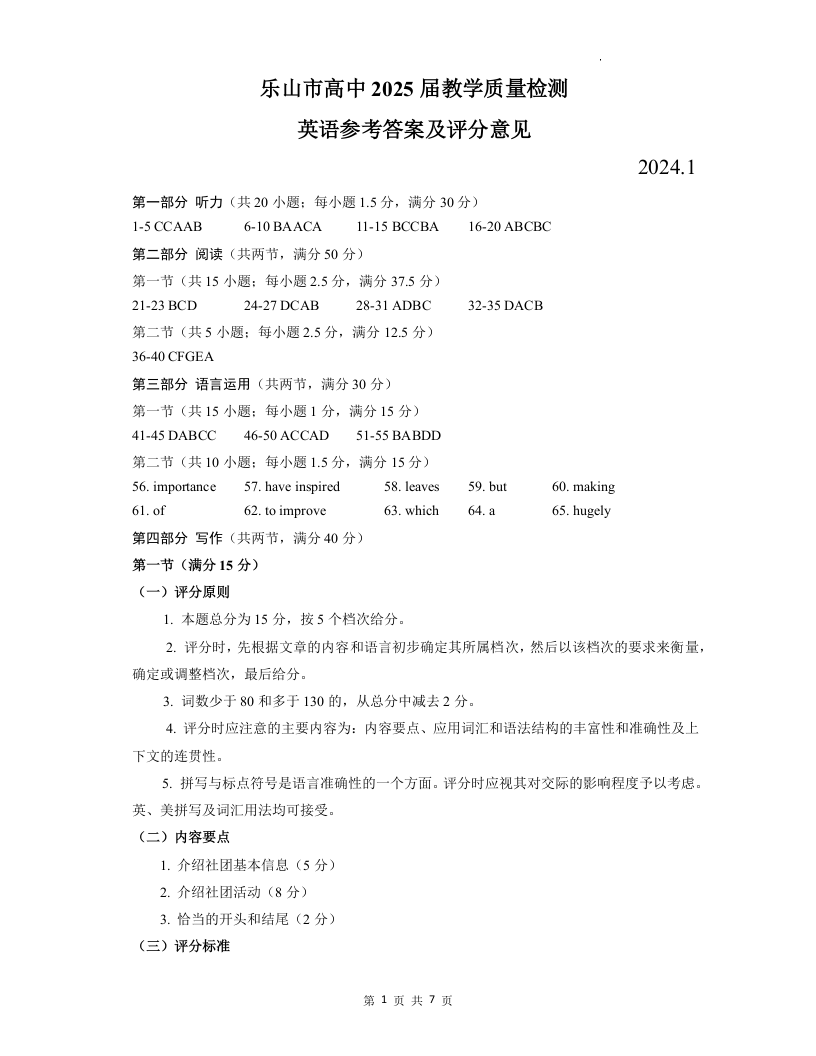 四川省乐山市2023-2024学年高二上学期期末考试英语答案