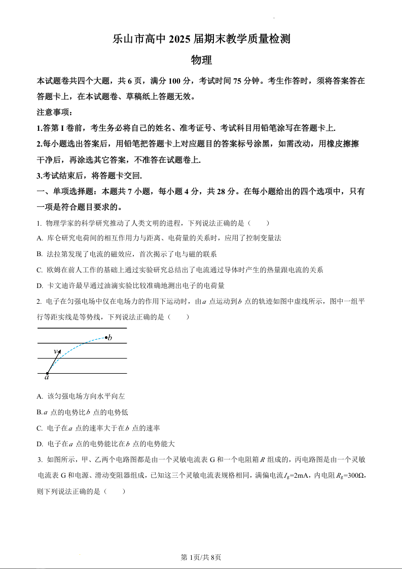 四川省乐山市2023-2024学年高二上学期期末考试物理(原卷版)