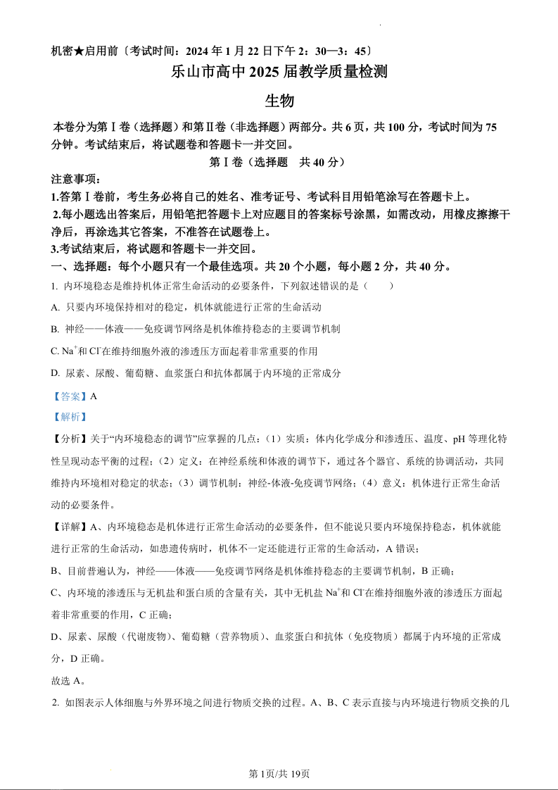 四川省乐山市2023-2024学年高二上学期期末考试生物(精品解析版)