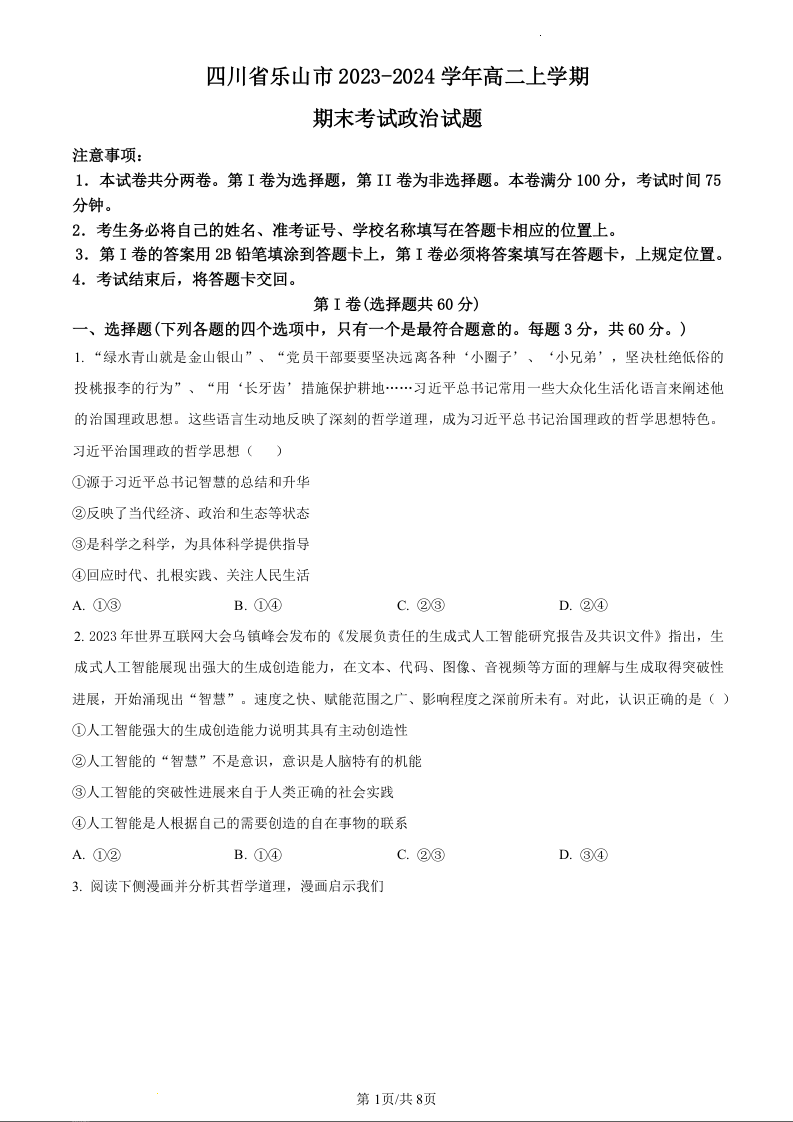 四川省乐山市2023-2024学年高二上学期期末考试政治(原卷版)
