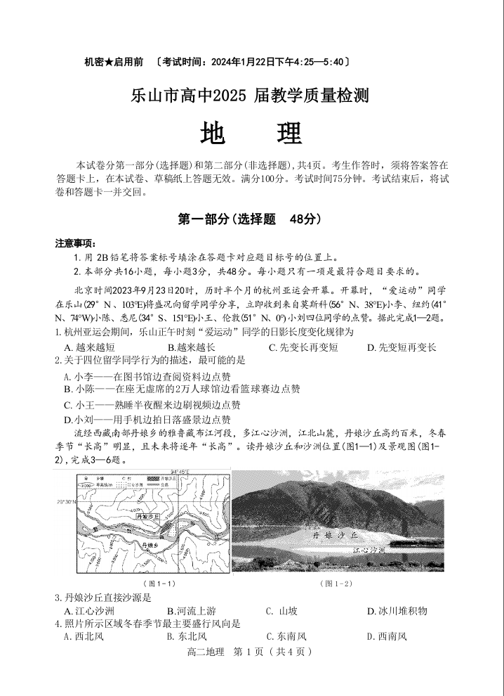四川省乐山市2023-2024学年高二上学期期末考试地理