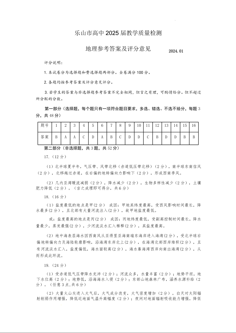 四川省乐山市2023-2024学年高二上学期期末考试地理答案