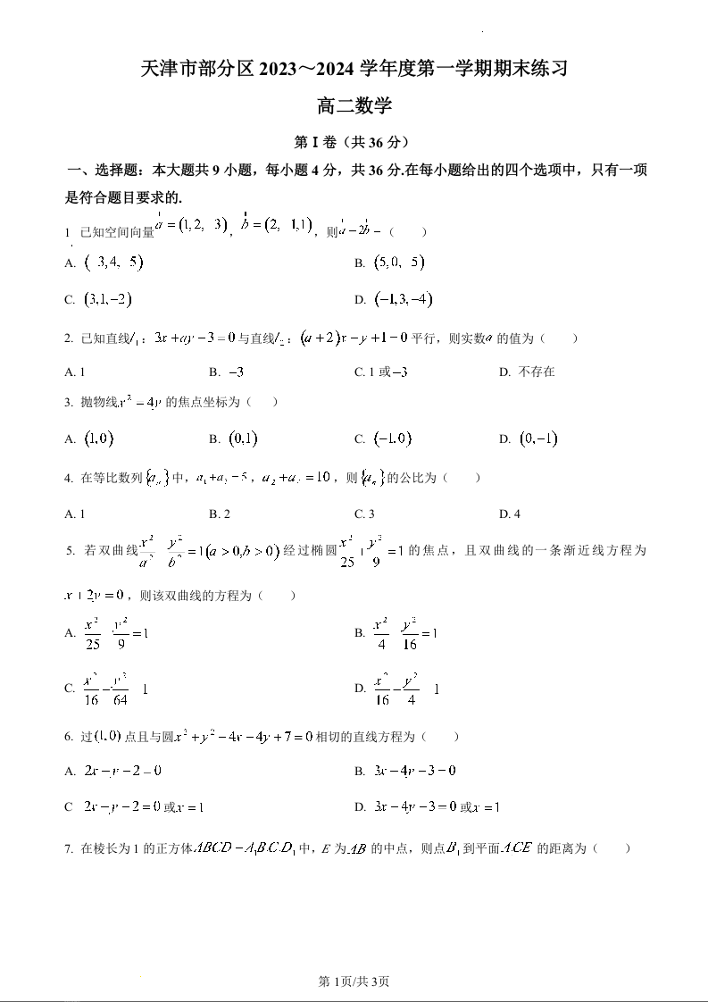 天津市部分地区2023-2024学年高二上学期期末考试数学(原卷版)