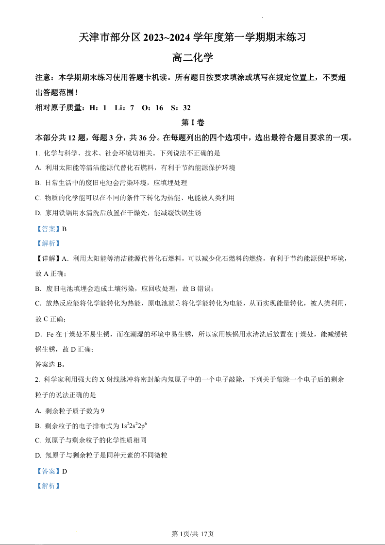 天津市部分地区2023-2024学年高二上学期期末考试化学(精品解析版)
