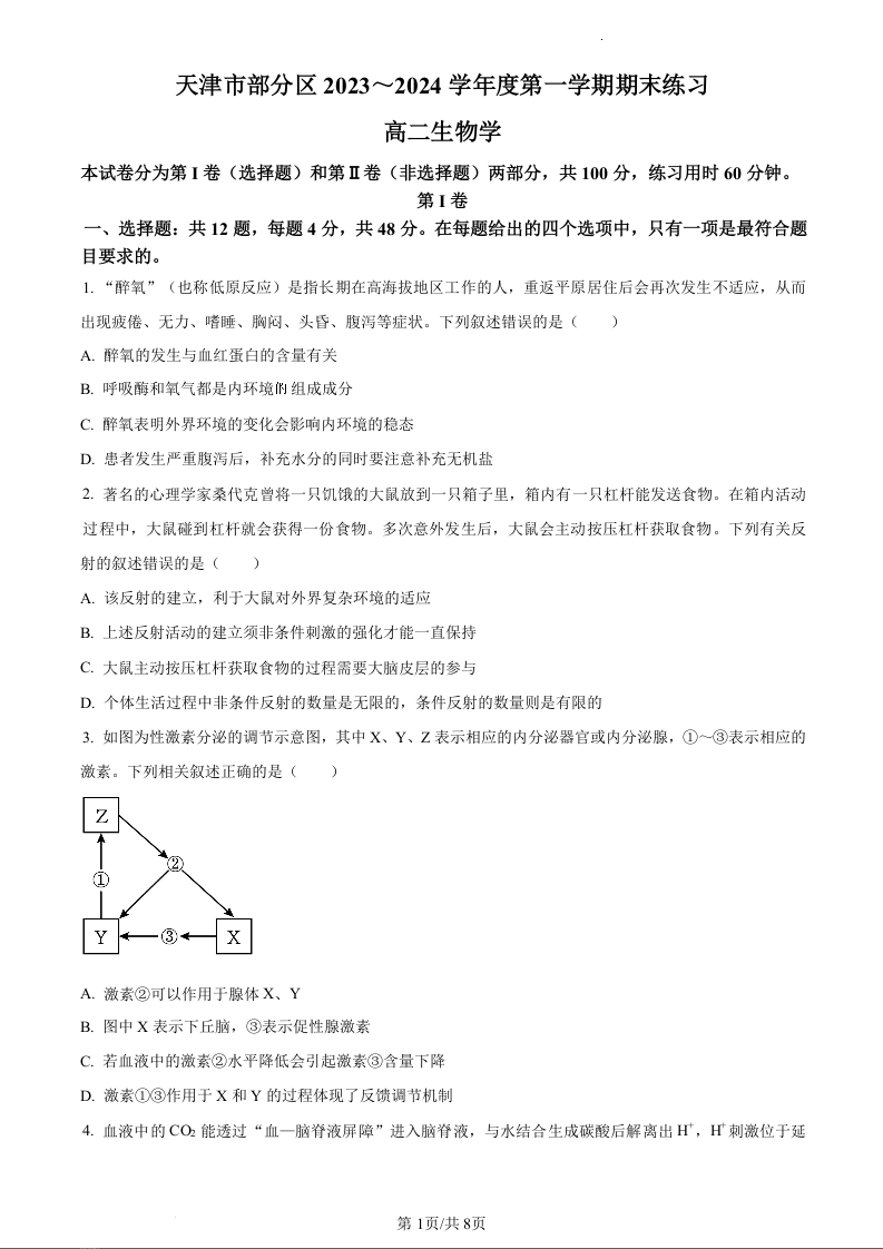 天津市部分地区2023-2024学年高二上学期期末考试生物(原卷版)